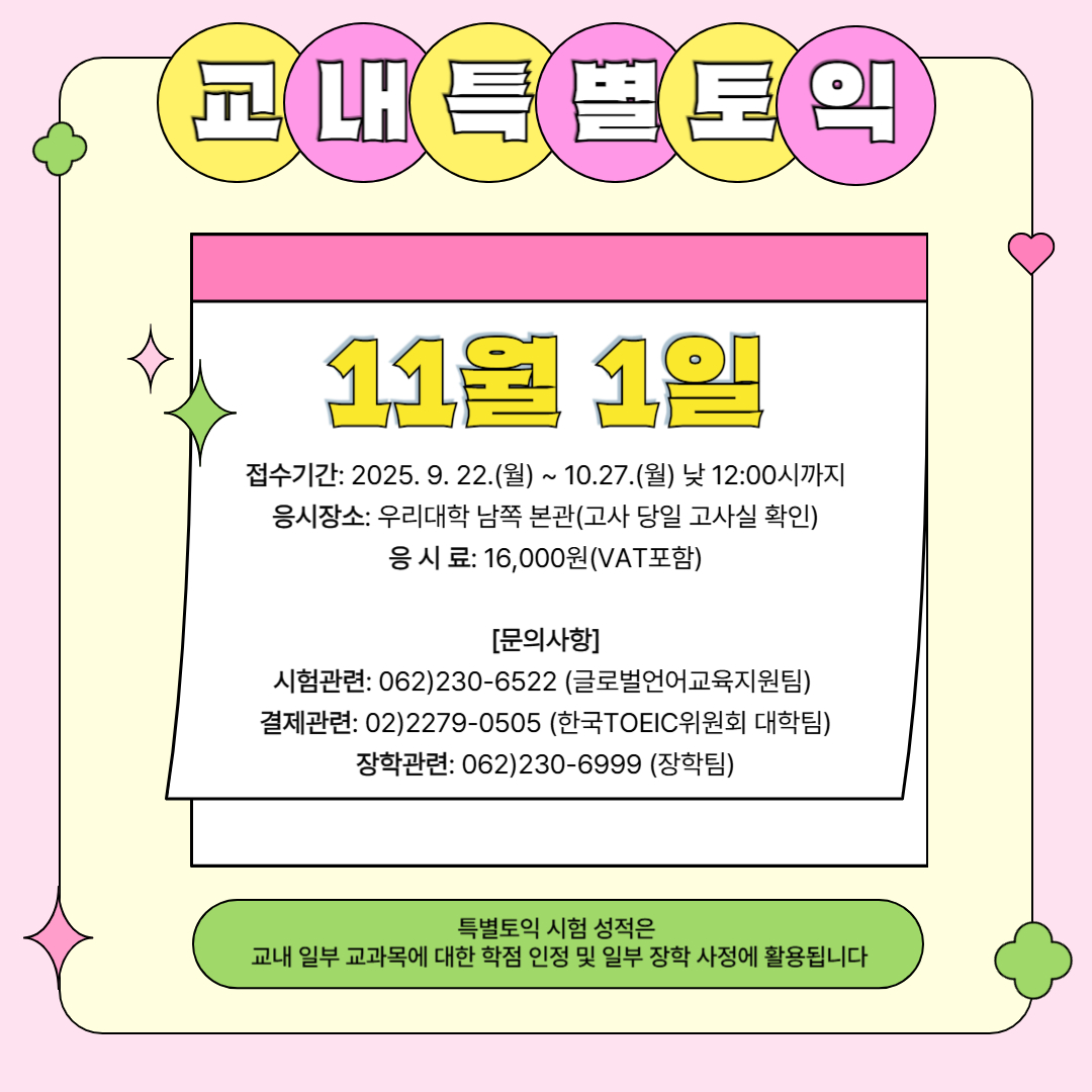YBM 한국TOEIC위원회 주관 본교 특별 TOEIC 시험 성적은 교내 일부 교과목에 대한 학점 인정 및 일부 장학 사정에 활용되므로 학생 여러분들의 많은 관심과 적극적인 참여를 바랍니다.