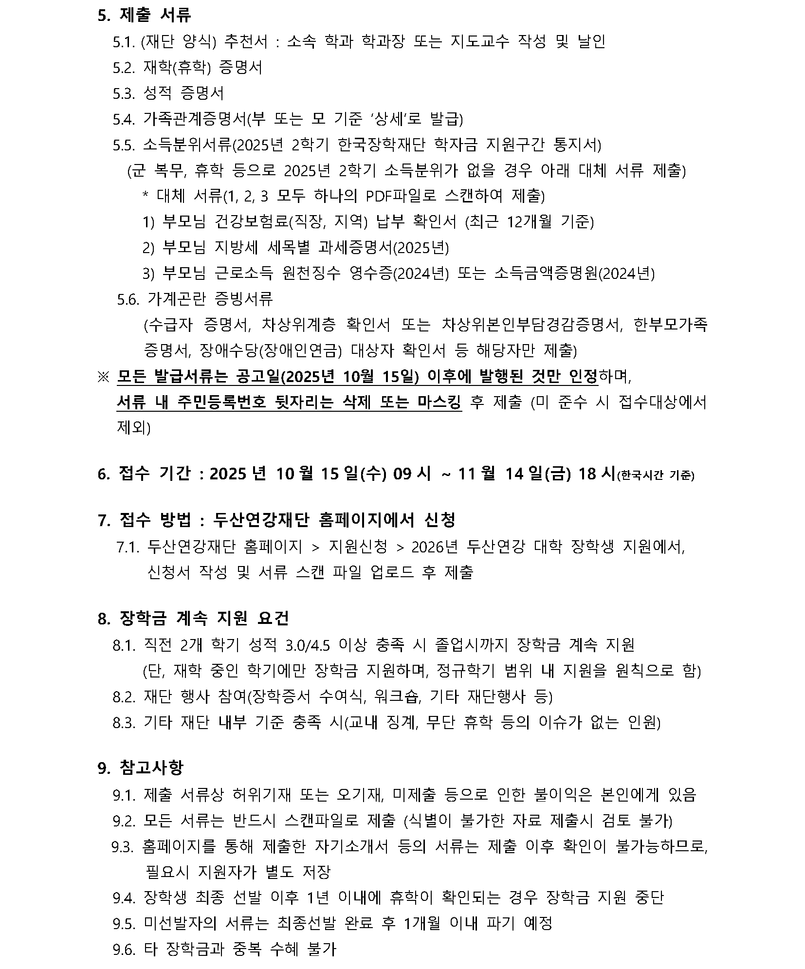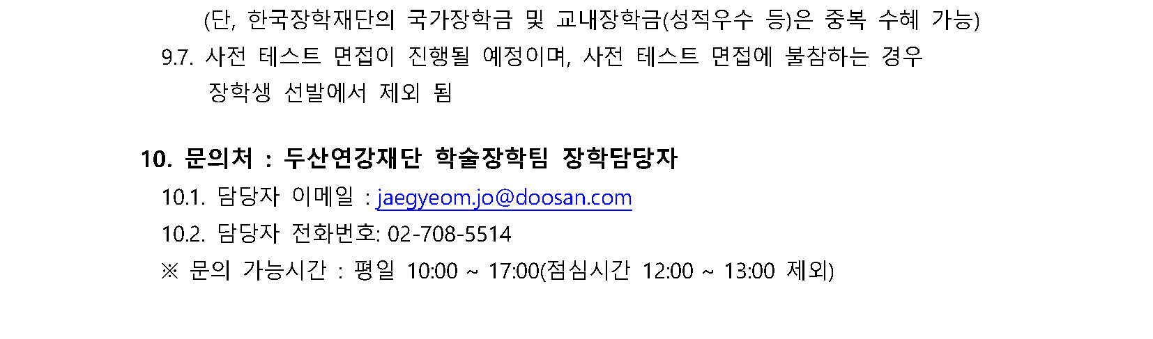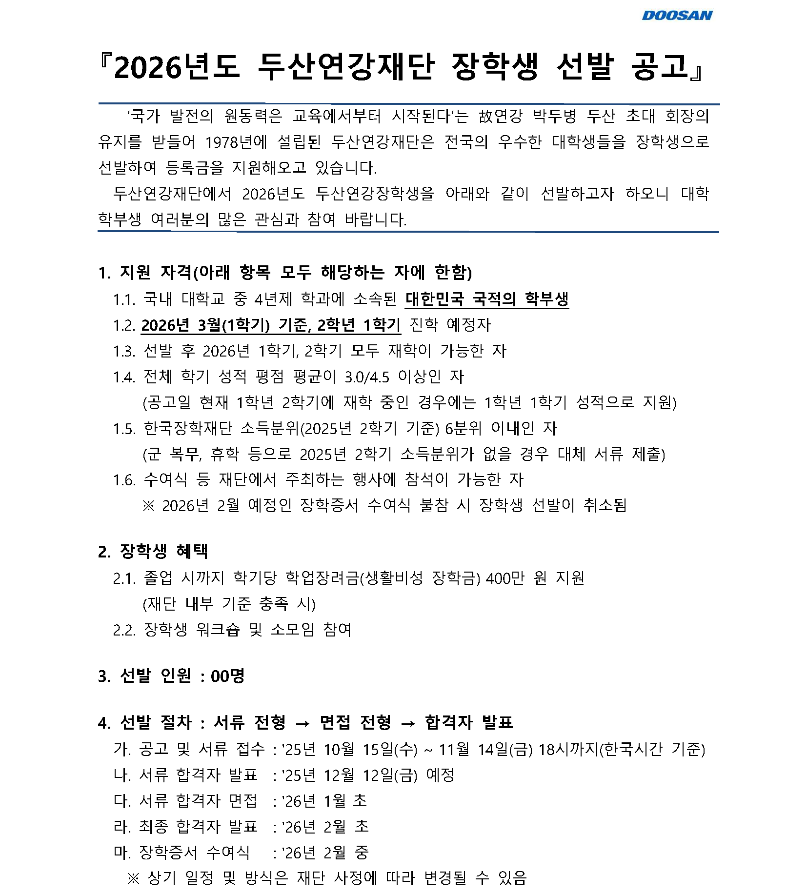 [두산연강재단]2026년도 두산연강재단 장학생 선발 공고문