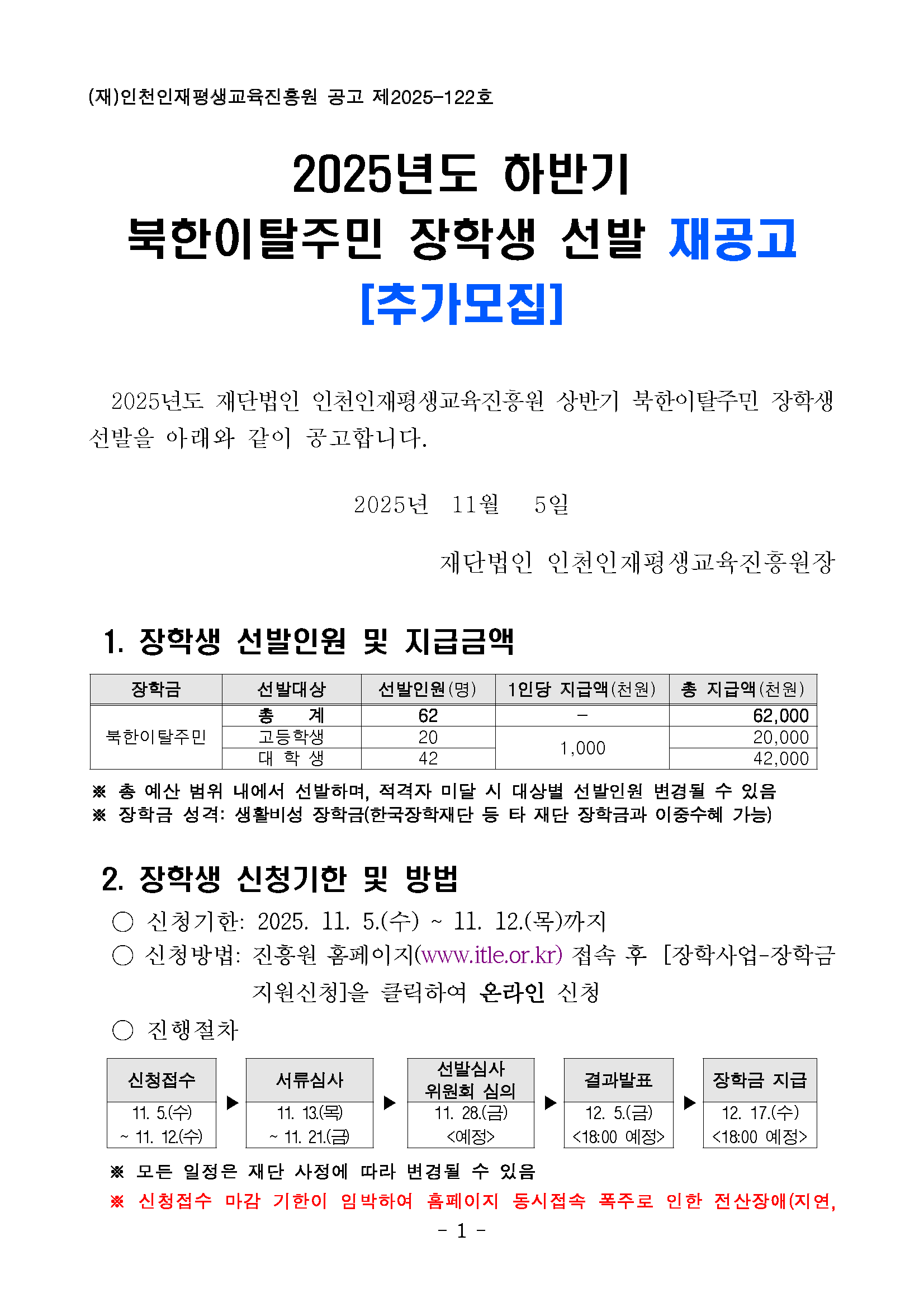 [(재)인천인재평생교육진흥원]2025년 하반기 북한이탈주민 장학생 추가모집