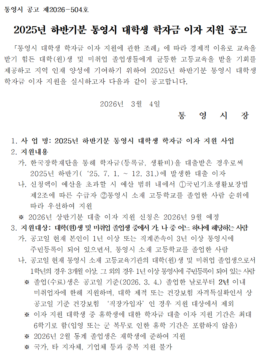 [통영시]2025년 하반기분 대학생 학자금 이자 지원 신청 안내