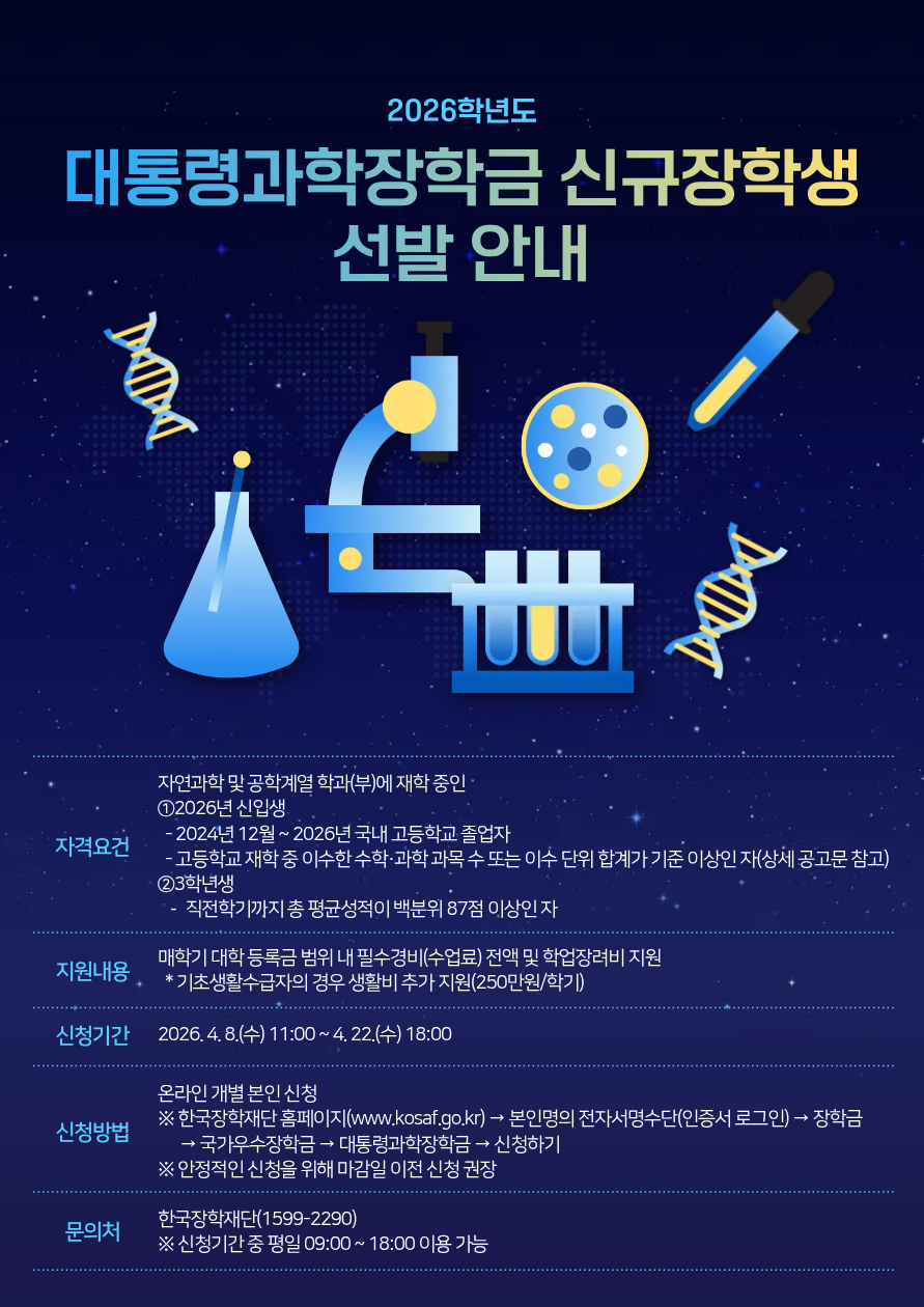 [장학금 접수] 2026학년도 대통령과학장학금 신규장학생 선발 안내